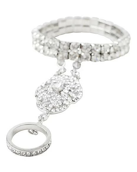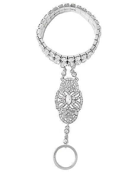 Celebrate the opulence and luxury of the roarin’ ’20s in this Gem Hand Chain Bracelet! This stunning piece features a bracelet adorned with two rows of faux gems, an ornately studded hand accent, and an attached ring. Complete your ’20s look with this captivating hand chain!