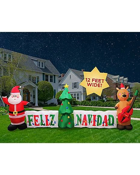 Wish everyone a Merry Christmas this holiday season by putting up this light up feliz Navidad inflatable. Youβll brighten up everyoneβs holiday once they see this amazing inflatable in your yard. This inflatable features a βFeliz Navidadβ banner with a Santa Claus and Reindeer on each side, as well as an inflatable Christmas tree in the center. The words feliz Navidad are decorated in lights and alternate red and green letters. Show off your Christmas Spirit by adding this inflatable to your next Christmas decorations display.