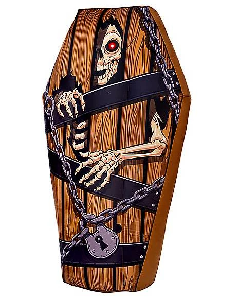 Bring your spooky scene to the next level with this light-up coffin inflatable. This inflatable coffin decoration features a red-eyed skeleton attempting to break free from its chained and padlocked enclosure!