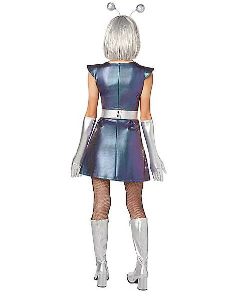 Drop down from outer space and get ready for some trick-or-treating in this incredible Galactic Girl Alien Dress Costume. This costume includes a dress, wig, headband, glasses, gloves, and a belt, giving you everything you need to look like the hippest alien on planet earth!