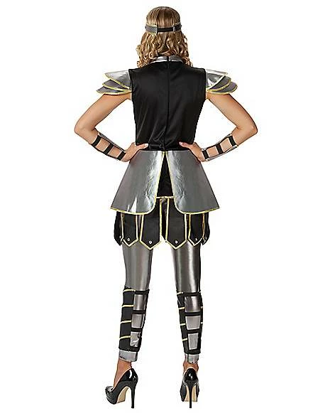 Go into battle in old-fashioned style on Halloween night with this medieval warrior costume! Featuring a metallic silver dress, matching leggings, arm and leg gauntlets, a cape, and a heroic headpiece, this costume will have you ready for battle in no time. This epic ensemble is available exclusively at Spirit Halloween, so grab one before you ride into battle!