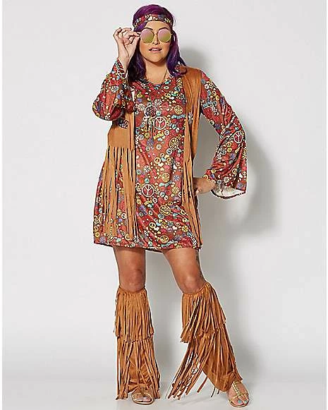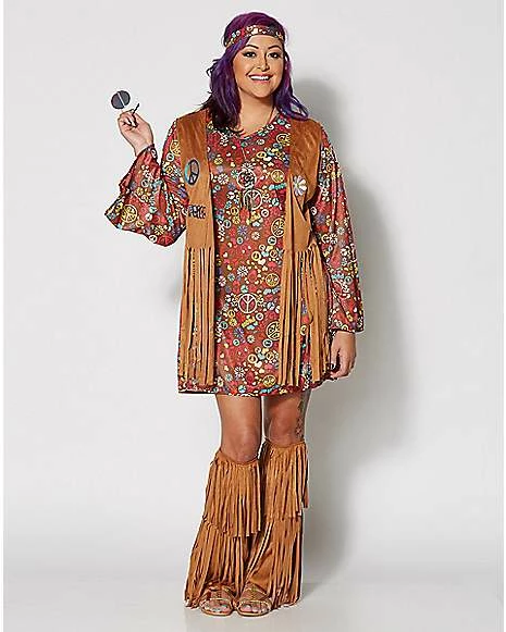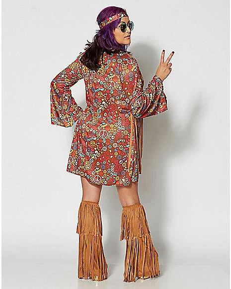 Let your carefree vibes shine through in the Peace and Love Hippie Adult Women’s Costume. You’re ready for any festival in this psychedelic printed dress with fringe vest, boot covers and printed headband.