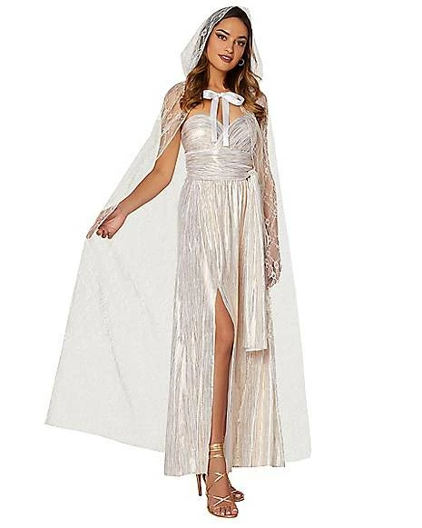 You’ll look fabulous this Halloween when you complete your costume by accessorizing with this beautiful White Lace Cape. This white lace cape will have you looking truly elegant at the costume party and will go great with any angel, bride, or fairy costume.