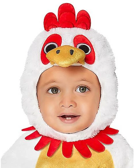 Hey, little chicken! Go pecking around for candy in this adorable chicken costume. Your little one will love dressing up as a feathered friend in this plush jumpsuit! A plush hood includes a big yellow beak, eyes, and a red head comb. Bock, bock!