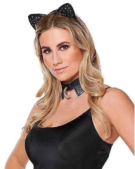 Let your inner black cat shine with this celestial cat costume kit! This pretty kitty kit includes a black headband with attached star-covered ears, a clip-on tail, and a choker necklace with a stunning moon charm.
