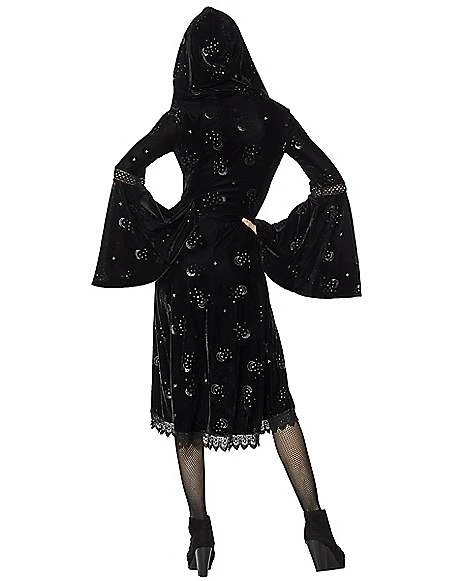 Create your very own look this Halloween when you use this hooded velvet dress as your base. Whether you want to become a witch or a vampire, this dress is sure to do the trick. With star and moon detail, a hi-lo hemline, bell sleeves, and scalloped lace detail, you’ll be ready for whatever Halloween night brings your way.