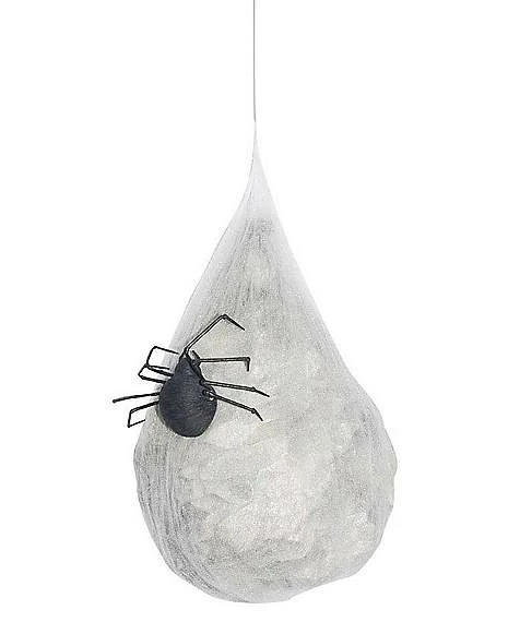 - Gigantic faux spider’s egg sac is crafted of a polyester blend, nylon and plastic and includes a giant black spider attached to the ball.