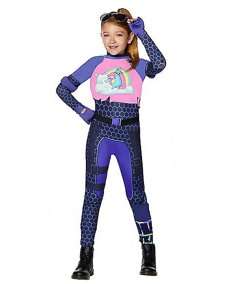 Light up the room this Halloween when you show off your shine in this officially licensed Fortnite Brite Bomber costume. If you love sunshine and rainbows, then this costume is exactly what you need this Halloween. Featuring the Brite Bomberβs signature purple jumpsuit, cropped unicorn t-shirt, belt, gloves, and aviator sunglasses, this costume has everything you need for a legendary Halloween. Our rare costume will no doubt be worthy of a victory royale!