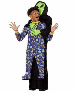 Greetings, earthling! You’ll look like you’ve been abducted this Halloween when you wear this alien abduction costume. Slip into the adorable space travel pajamas and let the alien carry your weight!