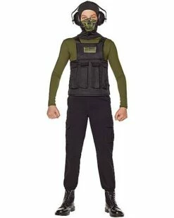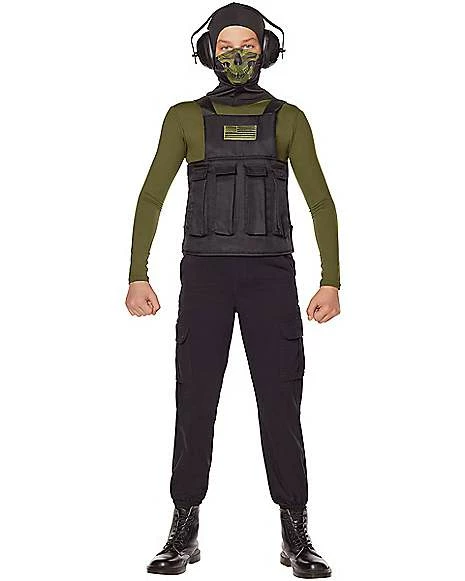 Become the ultimate army soldier when you wear the army costume kit! Featuring a vest, hood, headphones, and a skeleton mouth cover mask, this costume will have you prepared for any adventures that Halloween brings.