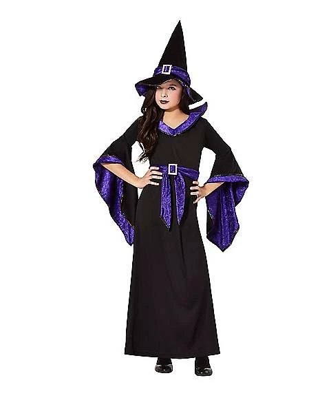 Make your magic mark this Halloween in this bewitching costume! Be the most stylish spell-caster on the block with this look which includes a beautiful black dress with a velvety purple belt and collar and, of course, a cute witch hat. Broomstick not included!