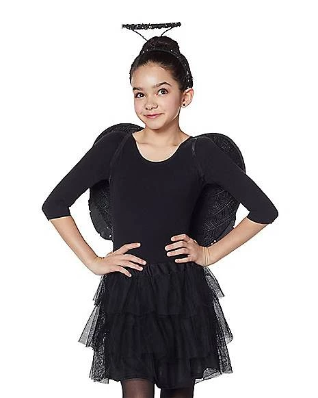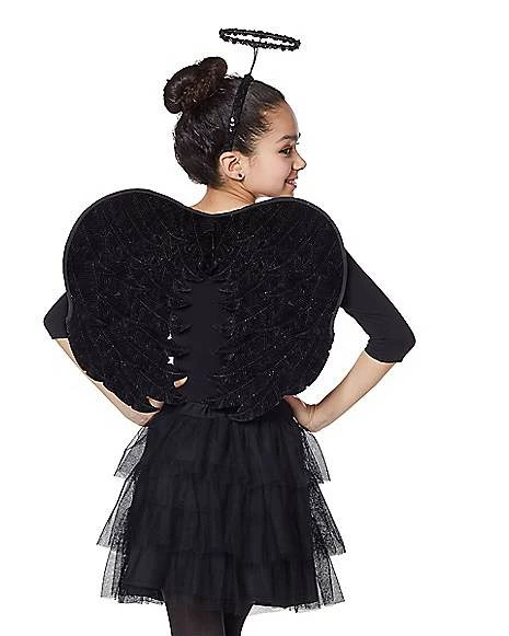 Take flight and embrace your dark side with this fallen angel kit! Soar through the sky with these black angel wings and matching halo headband. These dark halo and ominous wings, featuring a dark feathery appearance, are the perfect addition to any fallen angelβs costume.