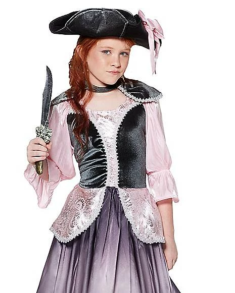 Yer wee pride ‘n joy will be th’ most elegant o’ all th’ pirates this Halloween. She’ll look like a lady when she wears this smart pink ‘n gray dress! Glitter tulle petticoat will give this dress some extra volume! Bow detail fer a feminine touch. Top off th’ look wit’ th’ velcro collar ‘n hat, ‘n ye’ll be ready fer a night o’ pirate-ing!