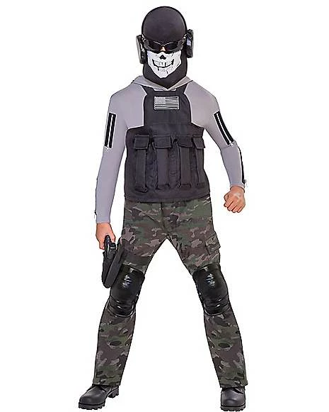 Plan your Halloween mission and execute it flawlessly in this scary looking Skull Commando child costume. The gray, black and green hooded shirt features a print face mask and comes complete with a vest, pants, belt, thigh holster, knee pads, headphones and sunglasses.