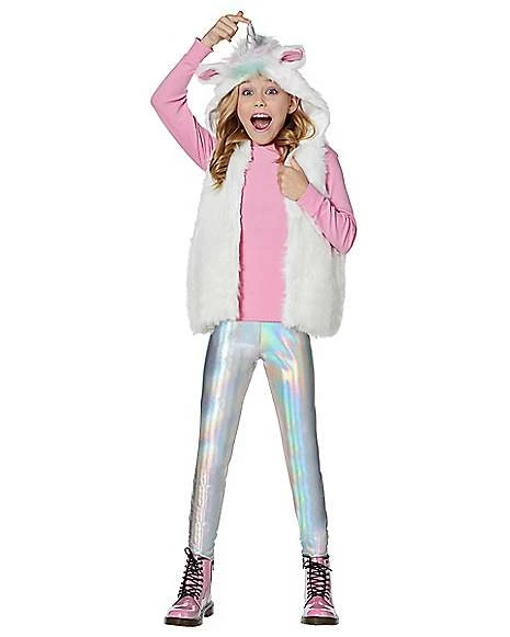 If your little one is a magical being, this unicorn costume kit is the perfect Halloween costume! The faux fur vest features an attached hood with a rainbow mane that will have your little one looking just like a unicorn! The 3D iridescent unicorn horn makes this costume complete! Step into the iridescent leggings and get ready for a Halloween night to remember!