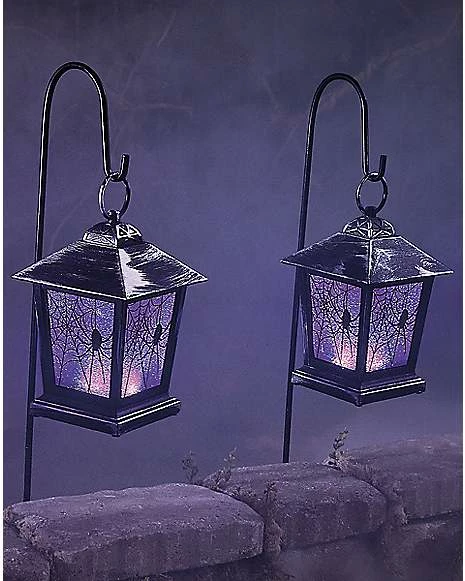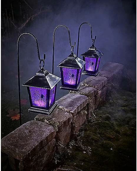 Illuminate your walkway with these Creepy Lantern Pathway Markers! The black lanterns feature a purple LED glow with black spiderweb and Spider detail. It will glow in the perfect eerie and frightful fashion this Halloween!