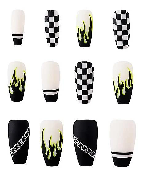 Get ready to jam out this spooky szn when you wear these punk rock press on nails. With 12 different styles to choose from, this fingernail set is perfect for you!