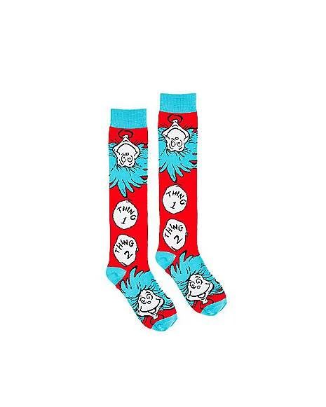 Have the coolest socks with the craziest characters when you wear these officially licensed Thing 1 and 2 Knee High Socks – Dr. Seuss! These matching socks are red with a bushy, blue-haired Thing on the top and bottom!